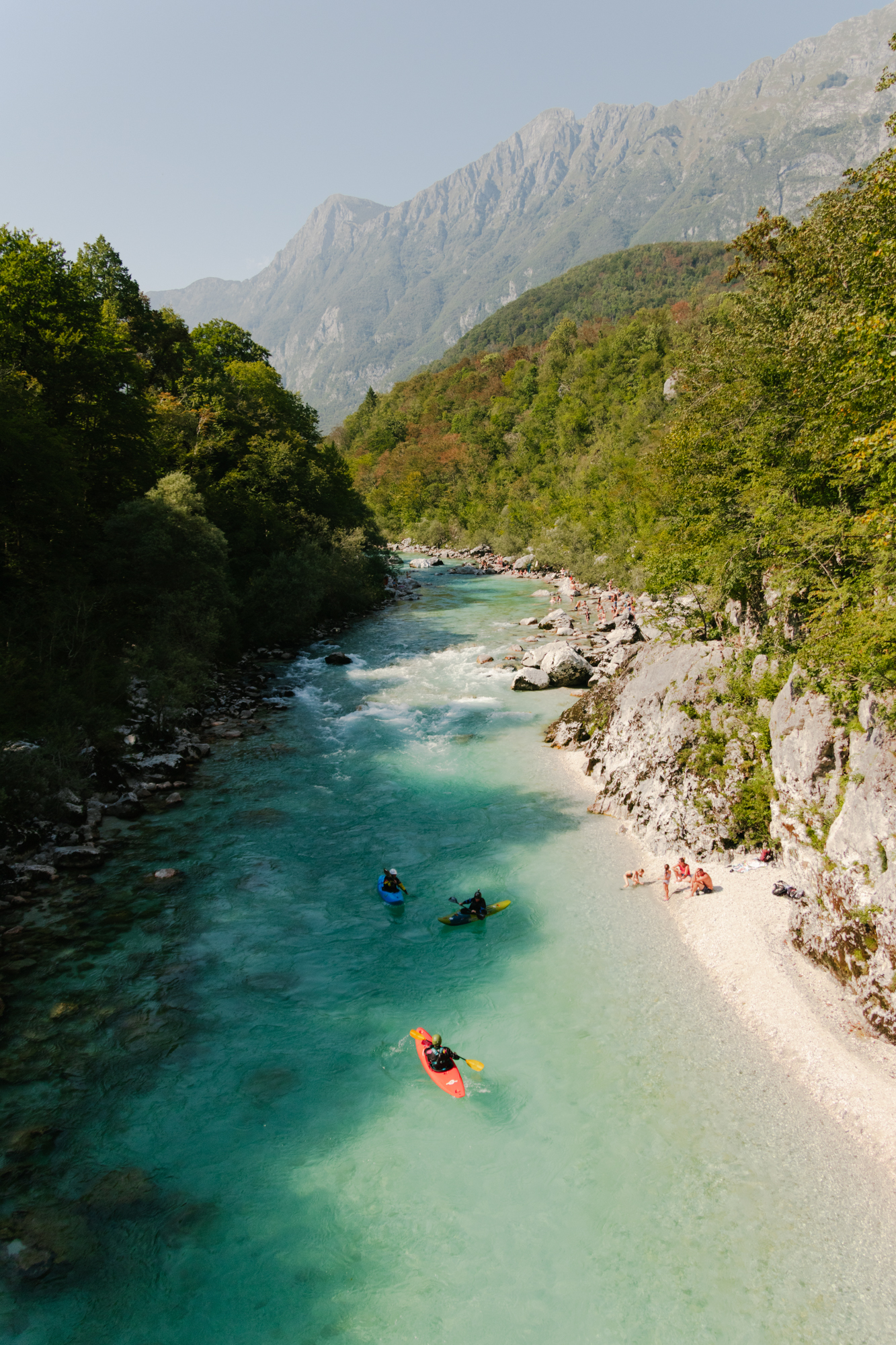 Der erste Stopp der Reise war das Soča-Tal. Wer es einmal gesehen hat, weiß, dass das Wasser des gleichnamigen Flusses fast schon surreal türkisblau scheint. Im kalten Nass tummelten sich Menschen, die verschiedenen Wassersportarten nachgingen, während ich und meine Freundin lieber am Ufer in der Sonne entspannten. Vom weiten, beruhigenden Blick über das Tal bis hin zu den teils rasanten Szenen am Flussufer: Mit dem 16–300mm hatte ich jederzeit die passende Brennweite zur Hand.