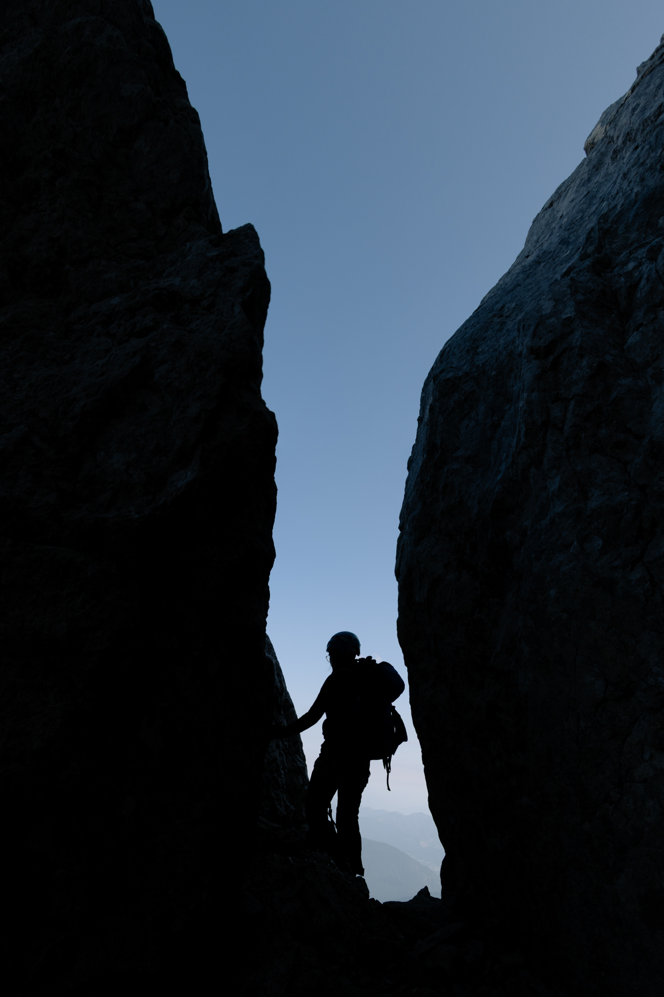 Eines meiner Lieblingsbilder entstand, als ich durch eine Felslücke ins Tal blickte. Meine Partnerin bahnte sich gerade ihren Weg durch die Felsen und ihre Silhouette wurde im Gegenlicht von den schroffen Wänden eingerahmt. Mit wenigen Handgriffen war die Szene eingefangen.
