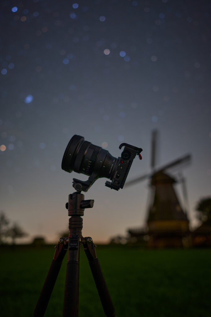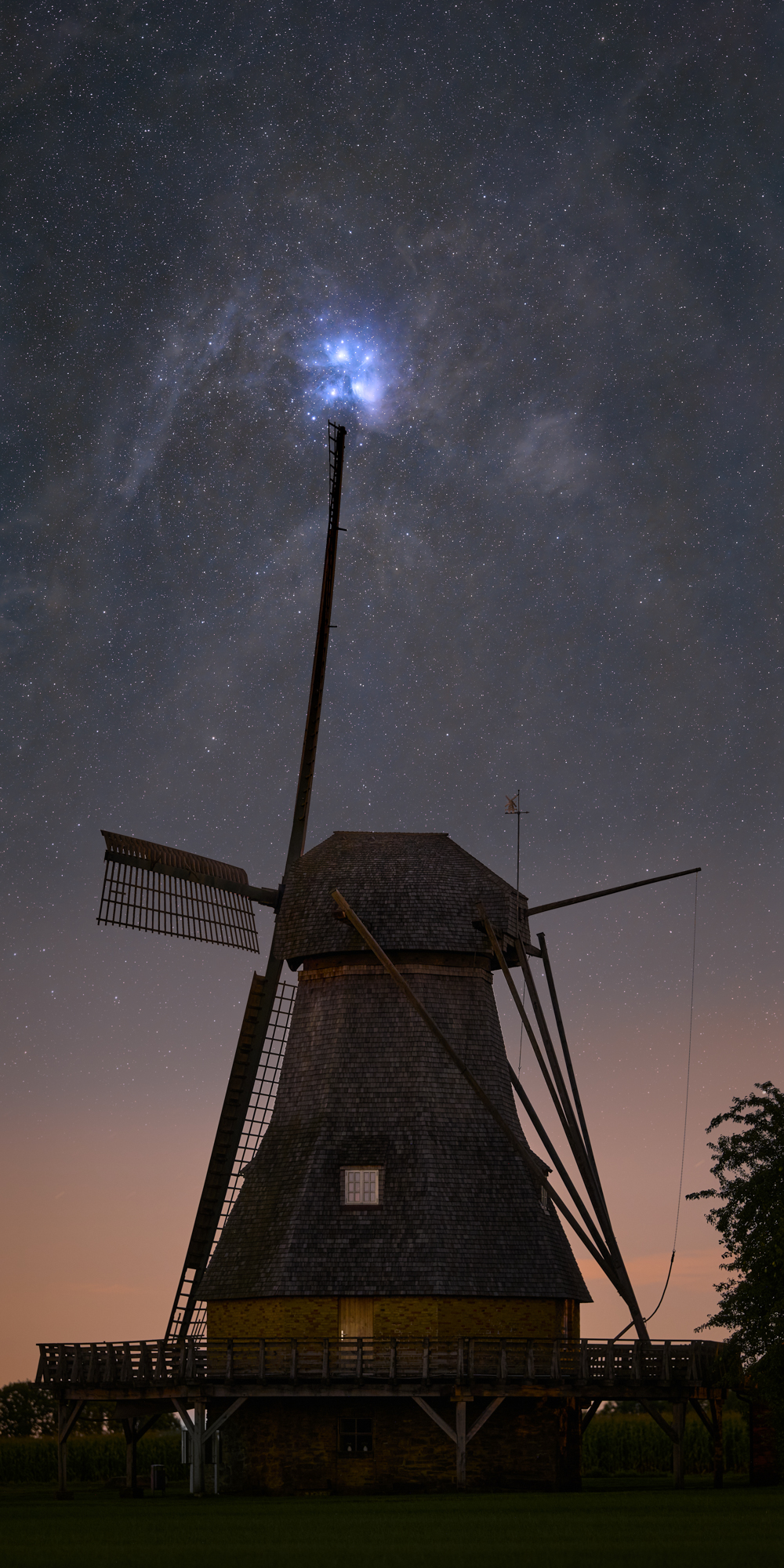 0:30: Mit etwas Euphorie fahre ich weiter zum zweiten Spot. Dass man in einer Nacht zwei Orte schafft, ist schon etwas Besonderes. Dann sehe ich die Wolken. Meine Endgegner. Eine Wolke, um genau zu sein. Eine einzige dicke Wolke schiebt sich über die Mühle hinweg. Das raubt Zeit, denn irgendwann geht dann doch der Mond auf und erleuchtet die Nacht wie eine dicke Christbaumkugel. Die Plejaden, das blau leuchtende Siebengestirn, sind aber unverdeckt und ideal für das 135mm. Und ein bisschen mit dem Bokeh des 14mm 1.4 spielen. Bokeh und Ultraweitwinkel sind zwei Sachen, die man selten zusammen sieht, deshalb reizt es mich und dafür habe ich mir extra einen Blumenstrauß mitgebracht. Und während ich noch ein wenig mit der Einstellung spiele, verschwindet die Wolke Gott sei Dank langsam aus meinem Blickfeld.