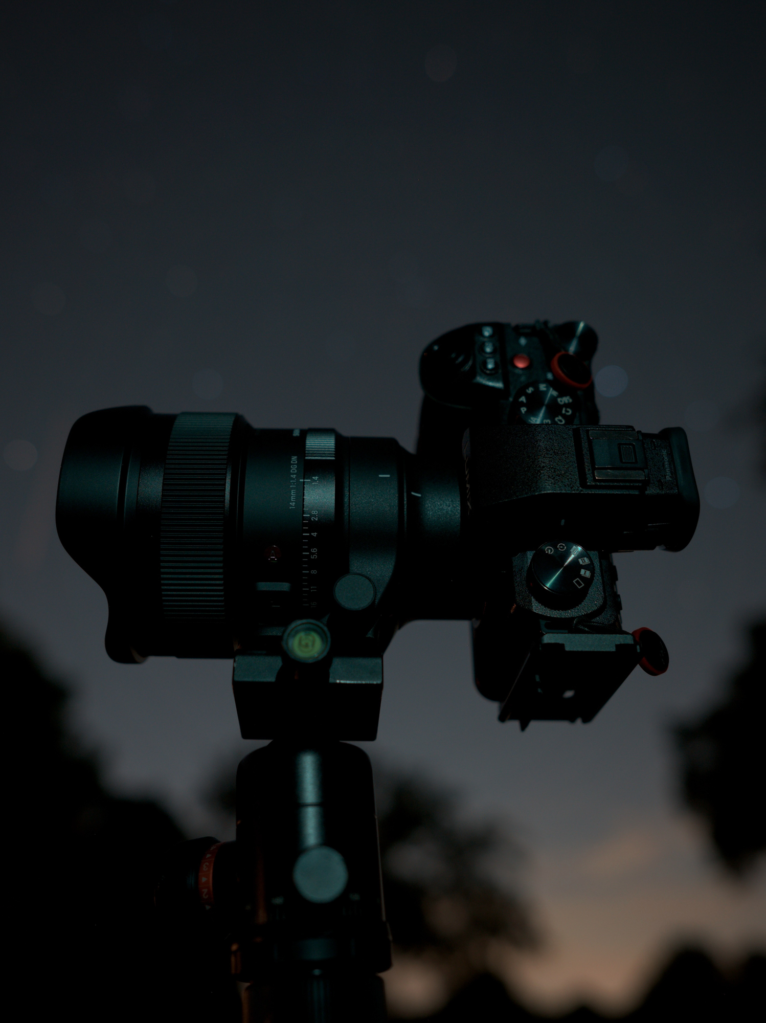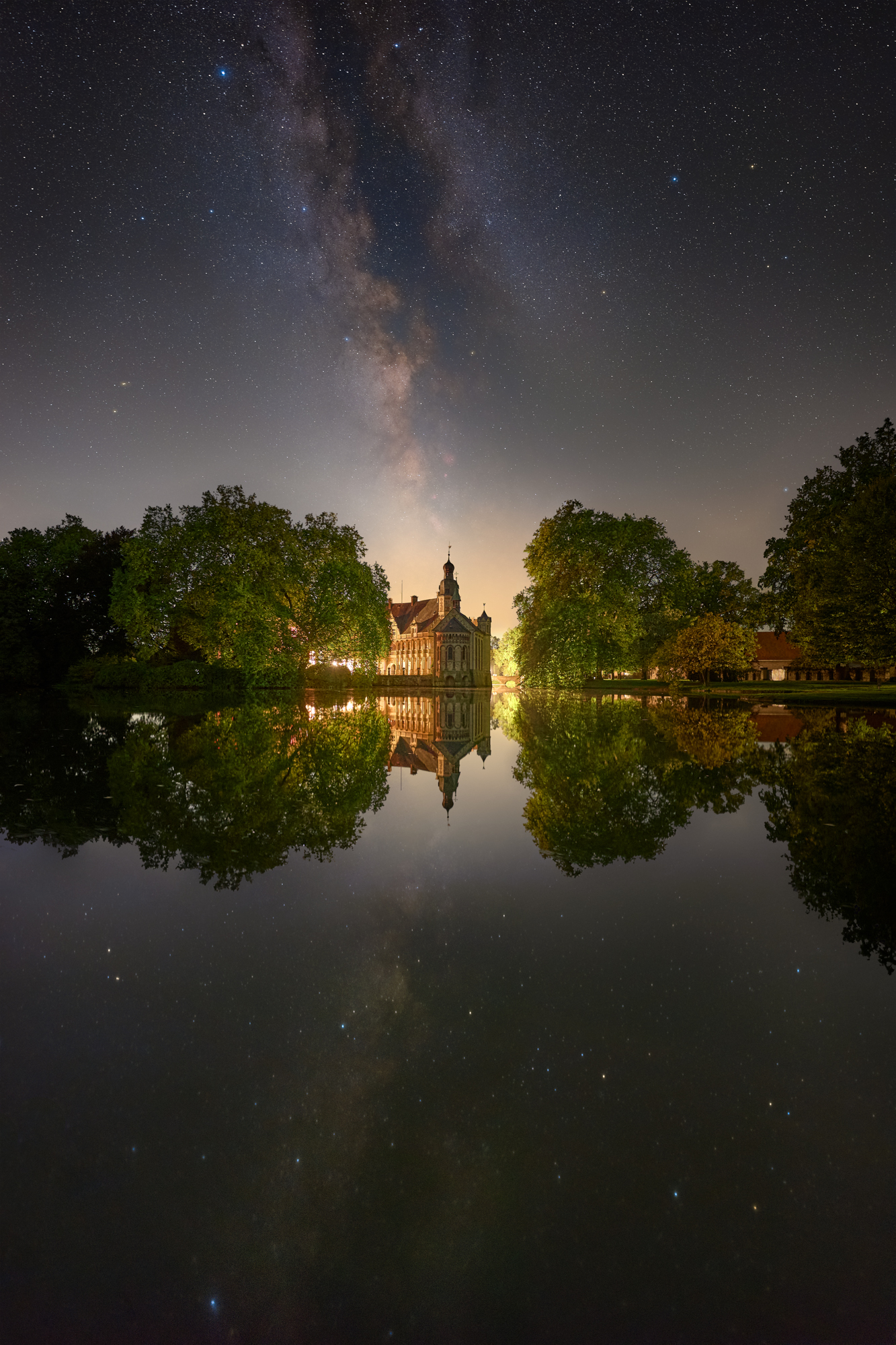 22:45: Die astronomische Dunkelheit beginnt, also die Zeit, zu der es so dunkel ist, dass sich die Milchstraße wirklich zeigt. Deshalb bin ich immer noch ein wenig gestresst. Eigentlich wollte ich doch schon am Spot sein, schon wieder zu knapp geplant. Die letzten paar Meter werden gespurtet. Und da liegt der erste Ort vor mir: ein Wasserschloss mit einem Graben, der bei dieser erstaunlich windstillen und warmen Nacht eine perfekt reflektierende Fläche bietet. Stative ausgepackt, Kameras und Tracker aufgeschraubt und die Komposition gesucht. Und mir fällt ein Stein vom Herzen: bei lichtstarken Festbrennweiten jenseits von f2.0 kann ich die Milchstraße bereits im Live-View der Kamera sehen. Und sie steht perfekt in der Nische zwischen den Bäumen über dem Schloss. Genau wie geplant. Durch den Ultraweitwinkel von 14mm bekomme ich gleich zwei Bilder in einem, den Himmel und die Reflexion der Sterne im Wasser. Das 135mm F1.4 DG | Art bildet einen schönen Kontrast. Nah dran.