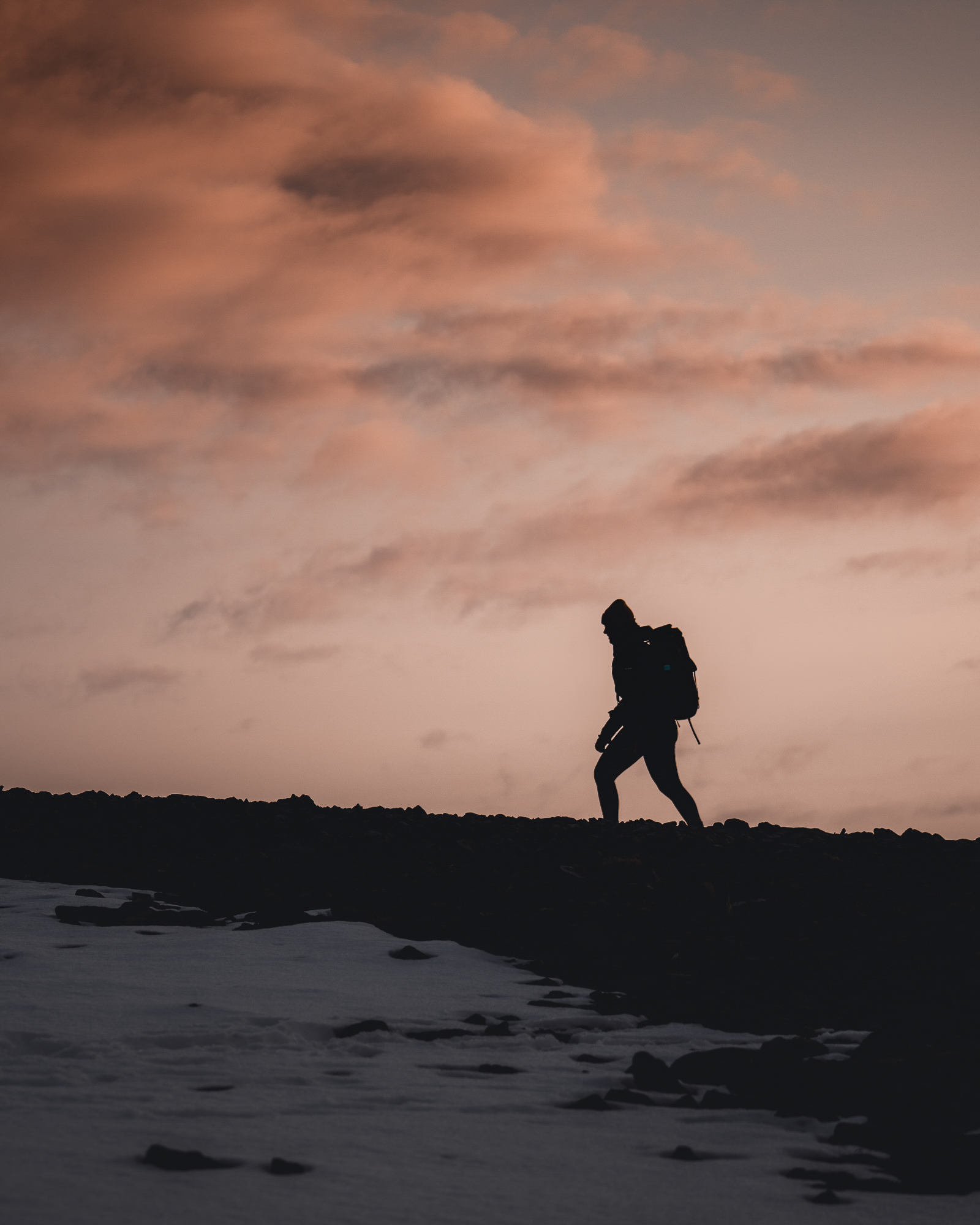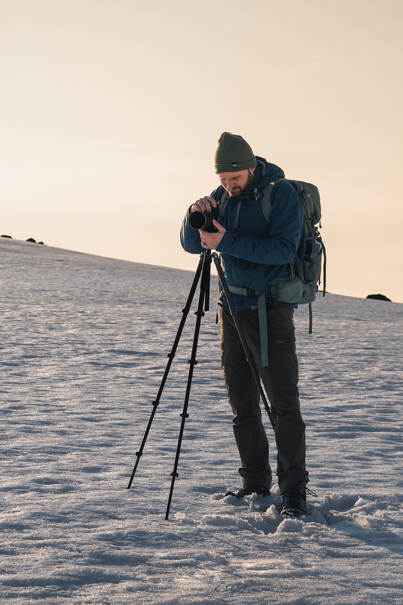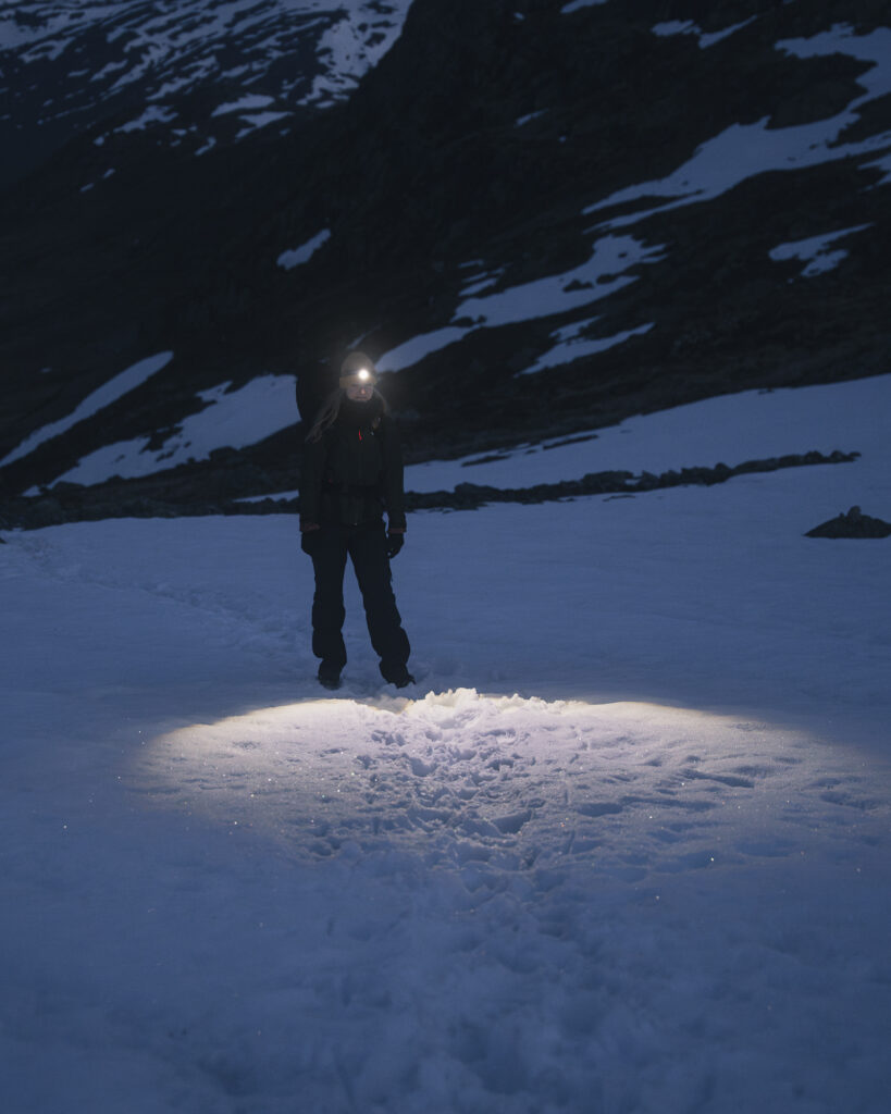 Auch wenn die Nächte im Norden während der Sommermonate kurz sind, gibt es je nach Ort ein paar Stunden Dämmerlicht und blaue Stunde. Während dieser Zeit waren wir häufig unterwegs, entweder kamen wir von einem schönen Ort zurück oder sind passend zum Sonnenaufgang losgewandert. Dieses Licht kann man auch gut nutzen, um Aufnahmen mit einem besonderen Vibe zu erstellen. Wir hatten die Idee ein Stirnlampen-Portrait zu machen. Die Belichtungszeit muss hierfür recht lang sein, sodass es gerade noch aus der Hand machbar ist, die Blende sehr weit geöffnet und das Motiv muss auch stillhalten. Der ISO wird unweigerlich etwas in die Höhe gehen, das kann man aber in der Nachbearbeitung wieder ausgleichen. Wir haben das Bild mit 1/50 aus der Hand geschossen und waren froh, dass das Sigma 24-70mm F2.8 DG DN II | Art eine 2.8er Blende hat und so gut mitgemacht hat. Damit das Stirnlampenlicht schön weich ist und einen Schein hat, haben wir einen Pro Mist ¼ Filter verwendet.