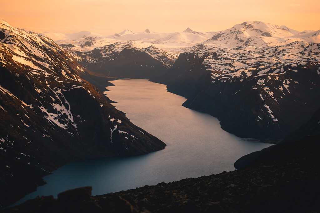 Natürlich kann man während der blauen Stunde nicht nur Menschen fotografieren, sondern auch Landschaft und so haben wir den wunderschönen Gjendesee mit dramatischen Wolken eingefangen.