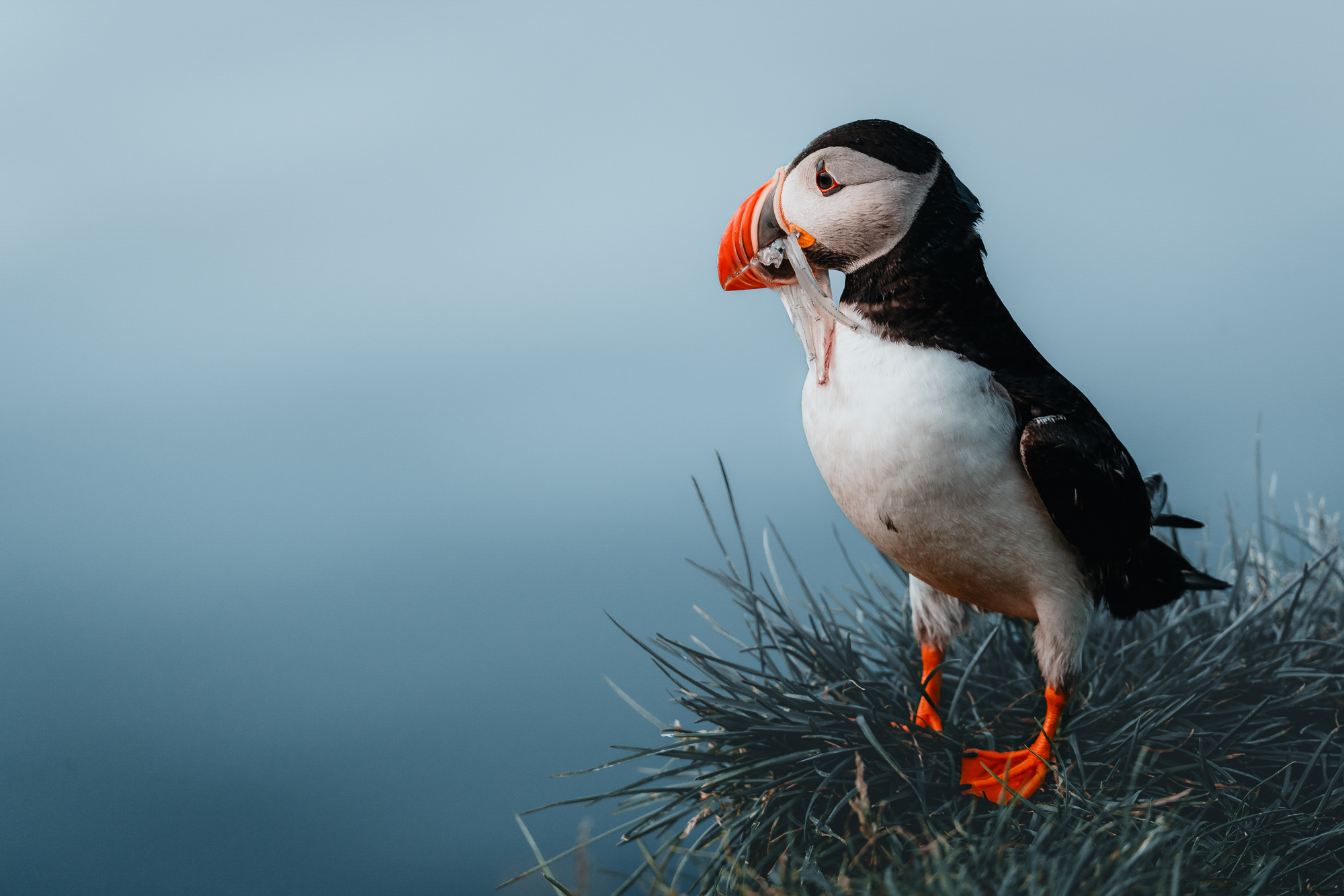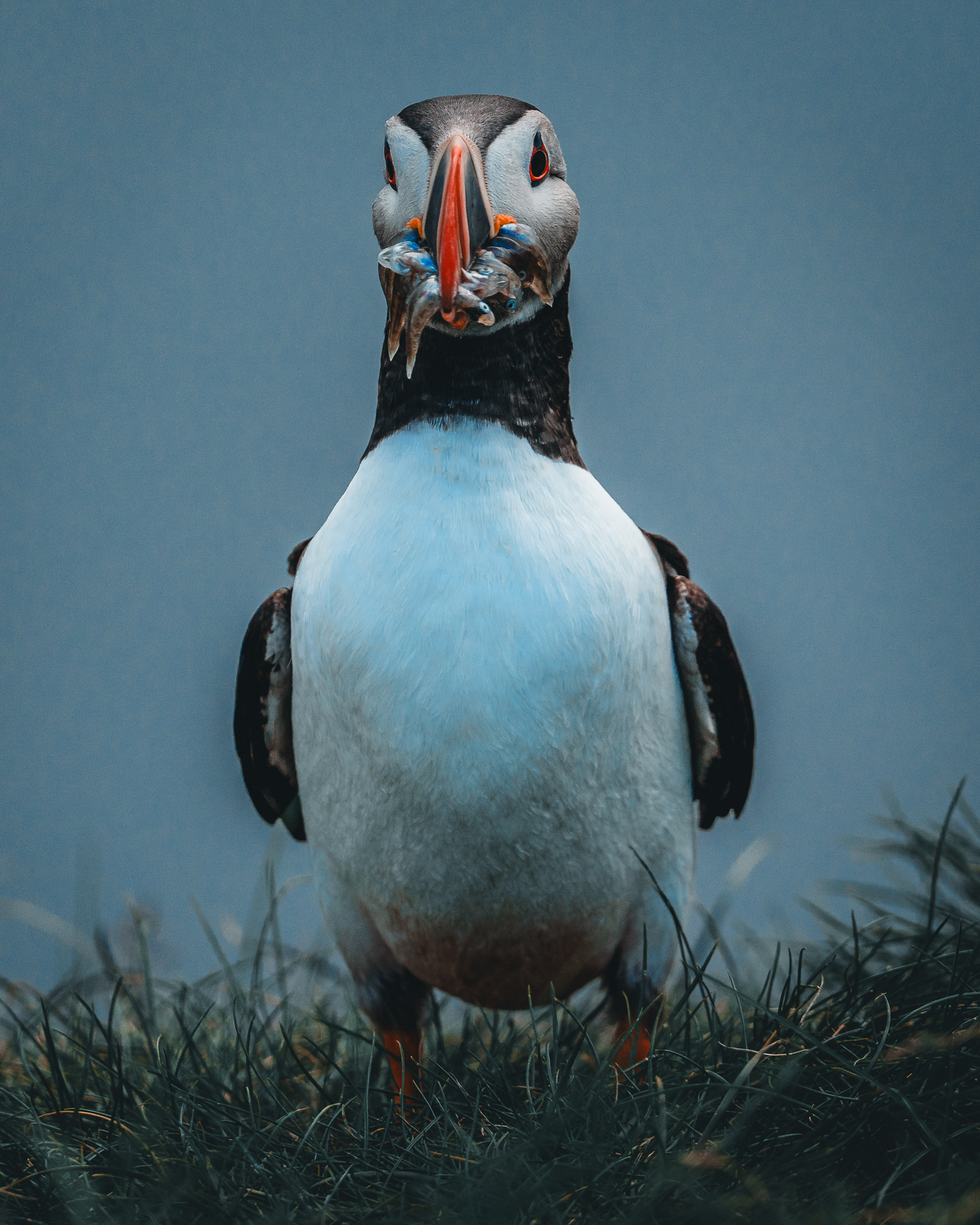 Nach einigen Stunden des Wartens war das Glück endlich auf unserer Seite und ein Papageitaucher landete mit Fisch im Schnabel direkt an der von uns erhofften Position. Und anstatt direkt in seinen Bau zu verschwinden, ließ das Tier sich dieses Mal ein klein wenig mehr Zeit und bot uns so die Möglichkeit, unsere Bilder zu schießen. So konnten wir sogar noch die Belichtungszeit verlängern, um gezielt den ISO zu verringern. Unsere Geduld hatte sich also am Ende ausgezahlt und wir wurden mit wunderschönen Bildern belohnt.