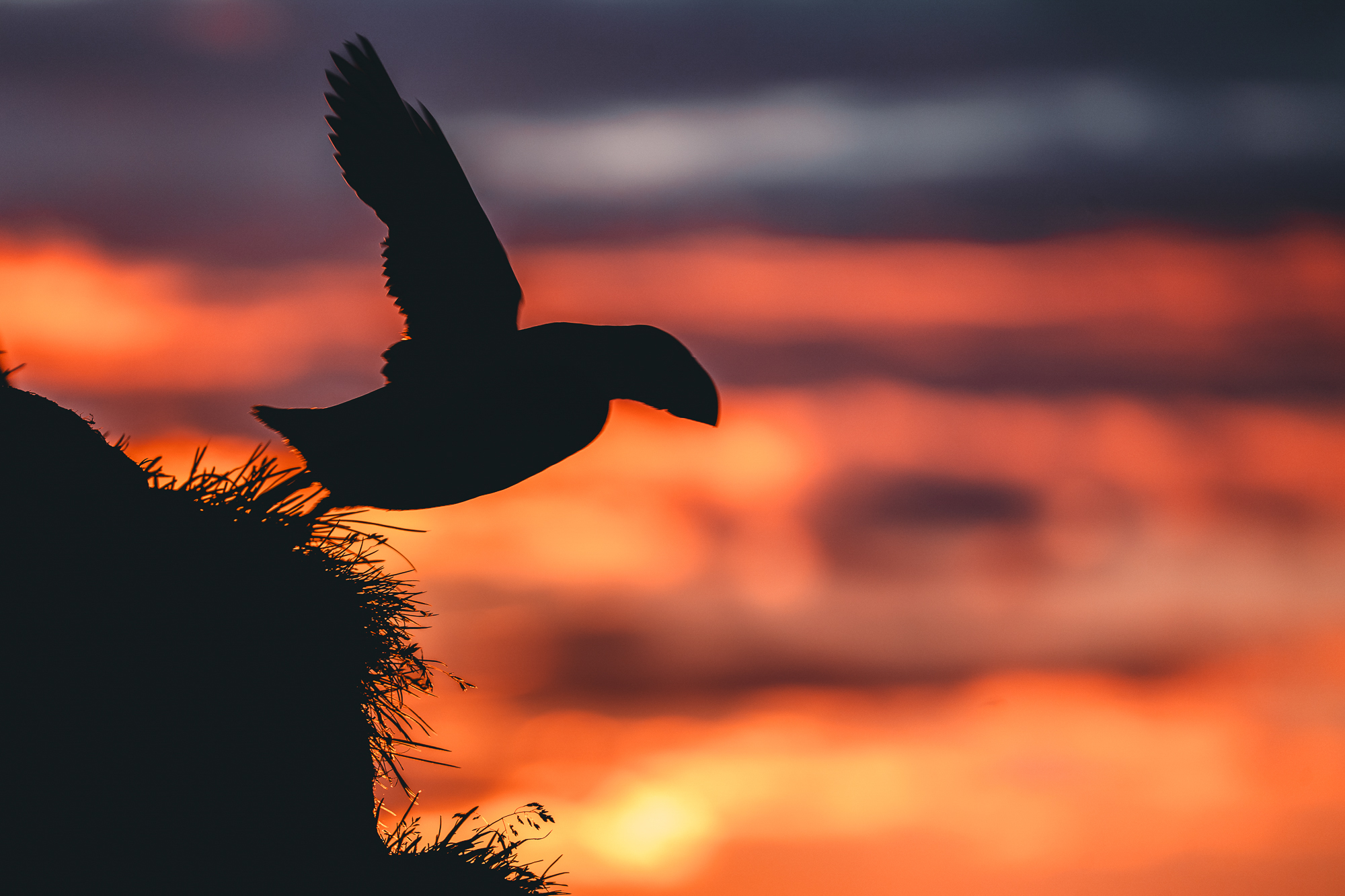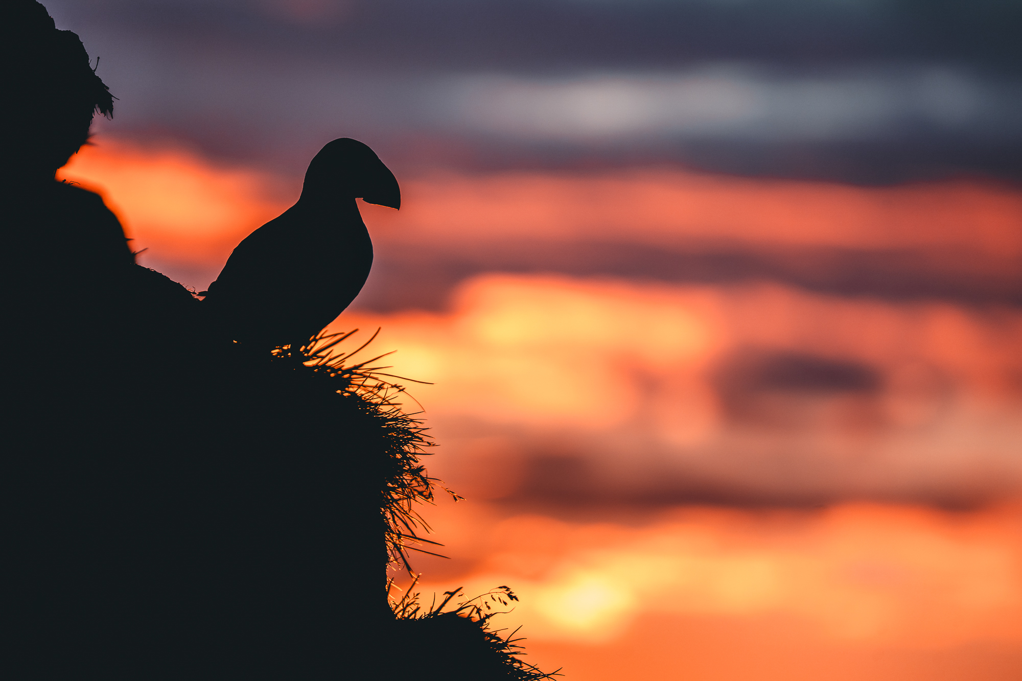 Besonders reizvoll waren aber auch Aufnahmen im Gegenlicht, in denen nur die Silhouetten der Papageitaucher zu sehen sind.