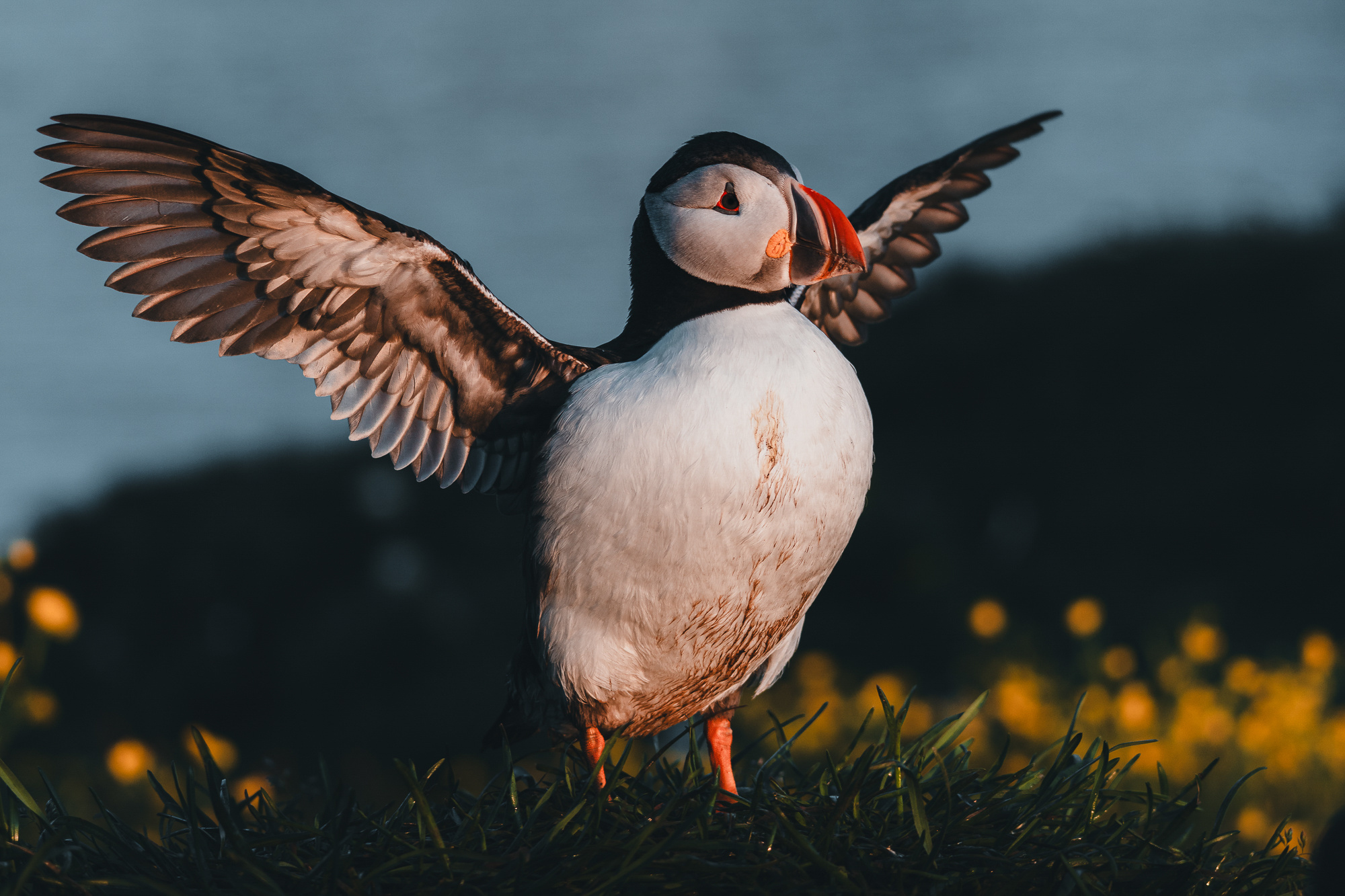 Die Strahlen der Abendsonne leuchteten auf den Federn der Vögel und wir versuchten das Licht bestmöglich zu nutzen. Als ein Puffin die Flügel ausbreitete, konnten wir so die einzelnen Federn in Szene setzen.