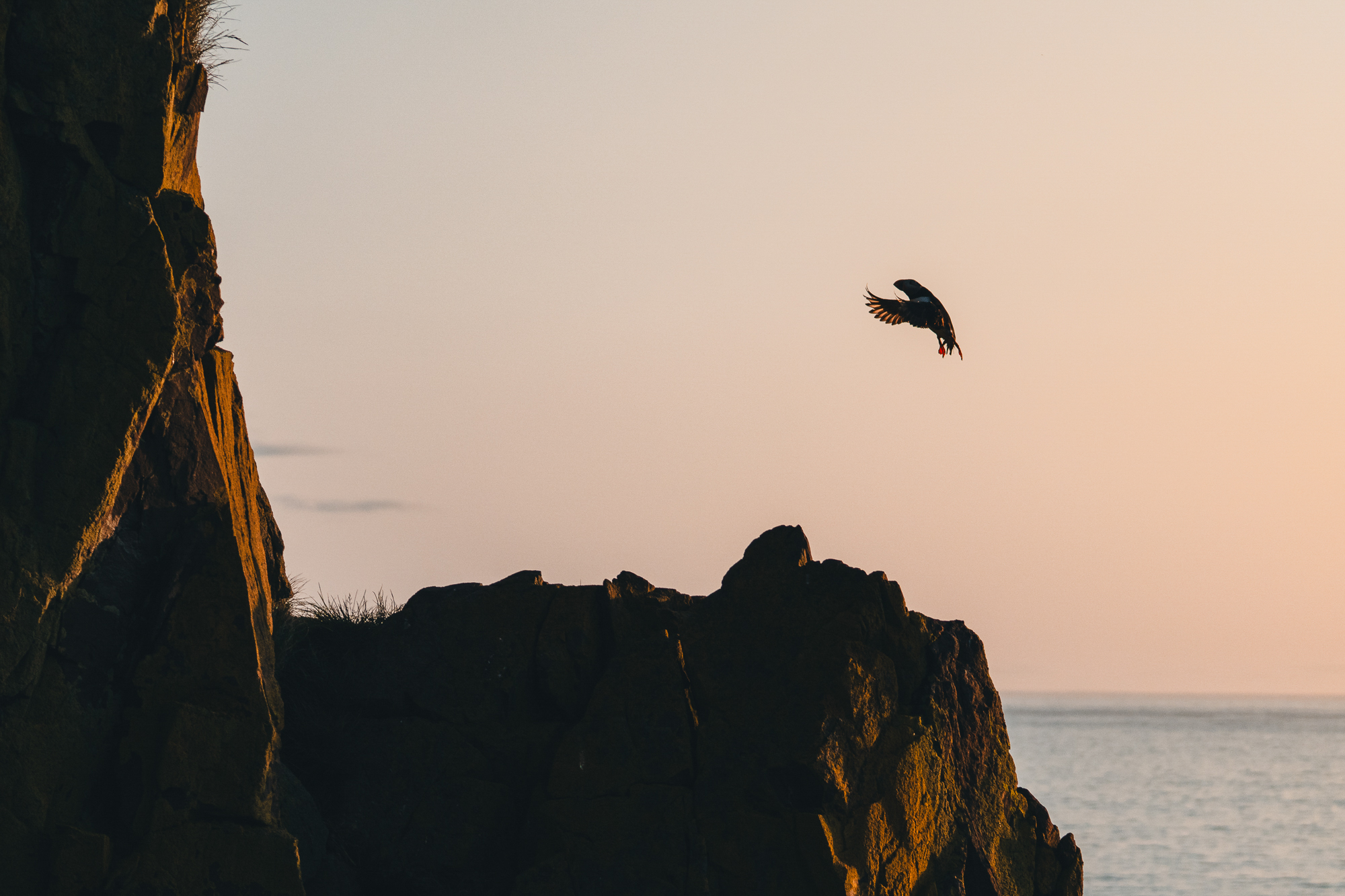 Erst bei unserem zweiten Besuch der Kolonie, bekamen wir endlich die Chance auf unser Zielfoto. Nachdem wir die Vögel ausgiebig beobachtet hatten, erkannten wir, welcher konkrete Spot am meisten Potenzial versprach. Es galt mehrere Dinge zu beachten: Wir mussten gute Sicht auf die Flugbahn der herankommenden Tiere haben, um sie rechtzeitig zu sehen. Zusätzlich wollten wir unser Motiv möglichst freigestellt, also mit Himmel oder Wasser im Hintergrund darstellen. Wir mussten also die Anflugbahnen der Puffins gut im Blick behalten, die Kameras bereithalten und stets mit dem Finger auf dem Auslöser warten. Wie auch beim Fotografieren im Flug wählten wir die Serienaufnahme, um eine bessere Wahrscheinlichkeit auf ein scharfes Bild zu erhalten und den perfekten Moment nicht zu verpassen.