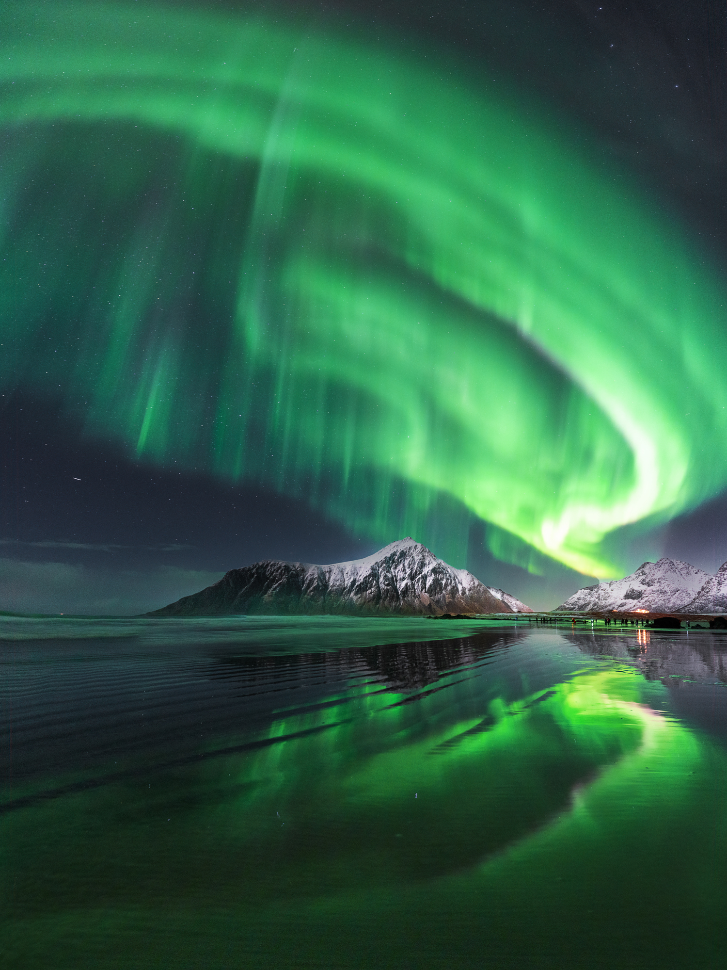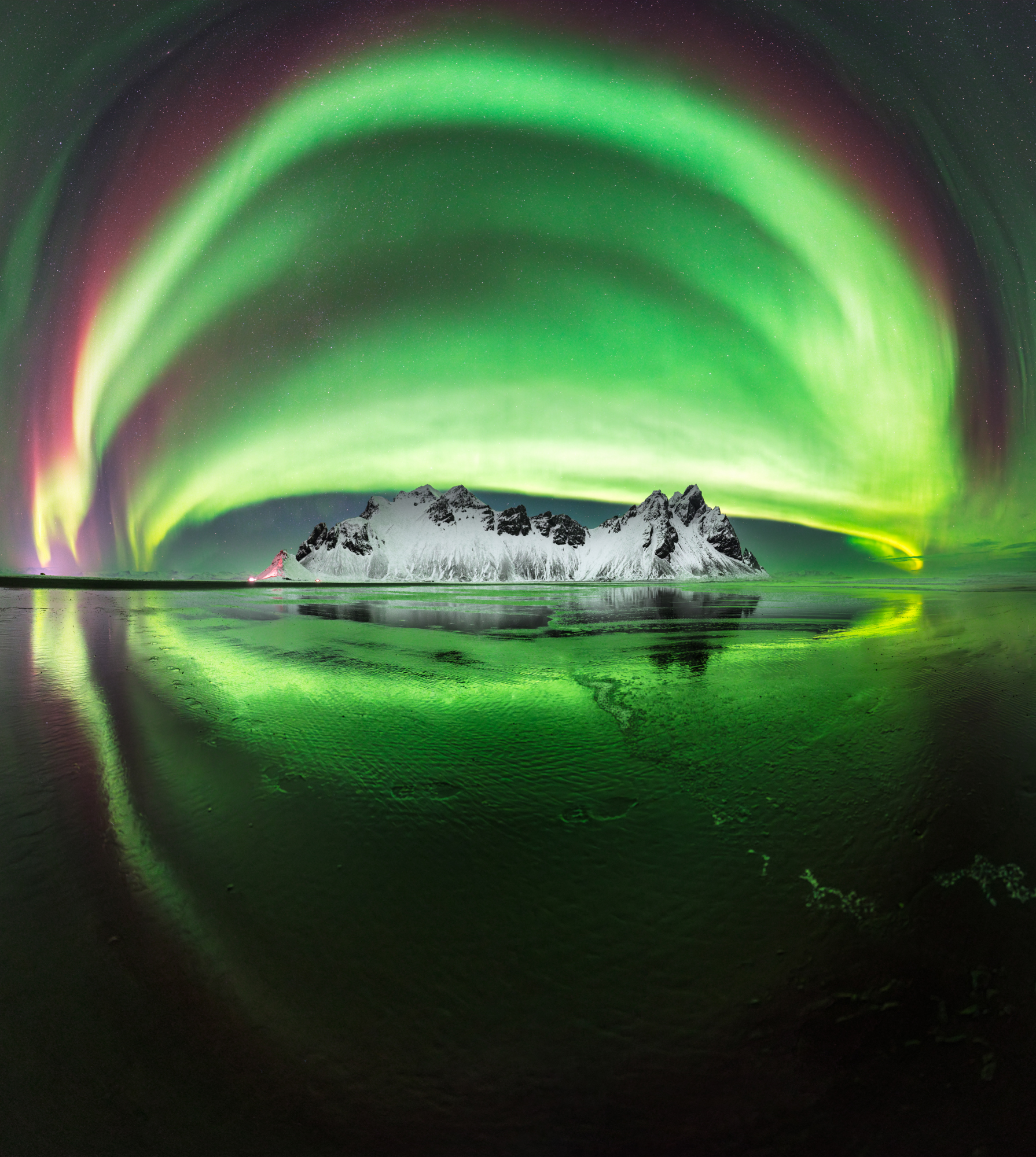 Ich genoss so sehr die Zeit, die dynamischen Nordlichter am Strand mit der schnellen Linse zu fotografieren, dass ich mich entschied, direkt im Anschluss nach Island zu reisen. Dort begab ich mich zum Vestrahorn, einem markanten Berg auf Ostisland mit vorgelagertem Strand. Hier hatte ich erneut Glück mit den Nordlichtern und konnte die Panoramafotografie mit der unglaublich schnellen Linse an die Spitze treiben. Nach einem einreihigen Panorama, bei dem die Nordlichter trotz 14mm und Panorama nicht komplett eingefangen werden konnten, entschied ich mich, ein dreireihiges Panorama, bestehend aus 15 Einzelfotos mit einer Belichtungszeit von 2.5 Sekunden, aufzunehmen. Das klingt unglaublich, wenn man bedenkt, dass man nur wenig Zeit hat, bis die nächste Welle kommt, und das während der Nacht. Aber mit dem 14mm und viel Probieren sowie nassen Füßen ist es mir schlussendlich gelungen. Das zusammengefügte Panorama zeigt die gesamten Nordlichter über dem Vestrahorn und die reflektierten Nordlichter am Strand im Vordergrund. Phänomenal! Wie bereits erwähnt, ist die Linse ein purer Genuss, weil man wieder mehr Zeit mit dem Probieren, also dem Fotografieren, verbringt.