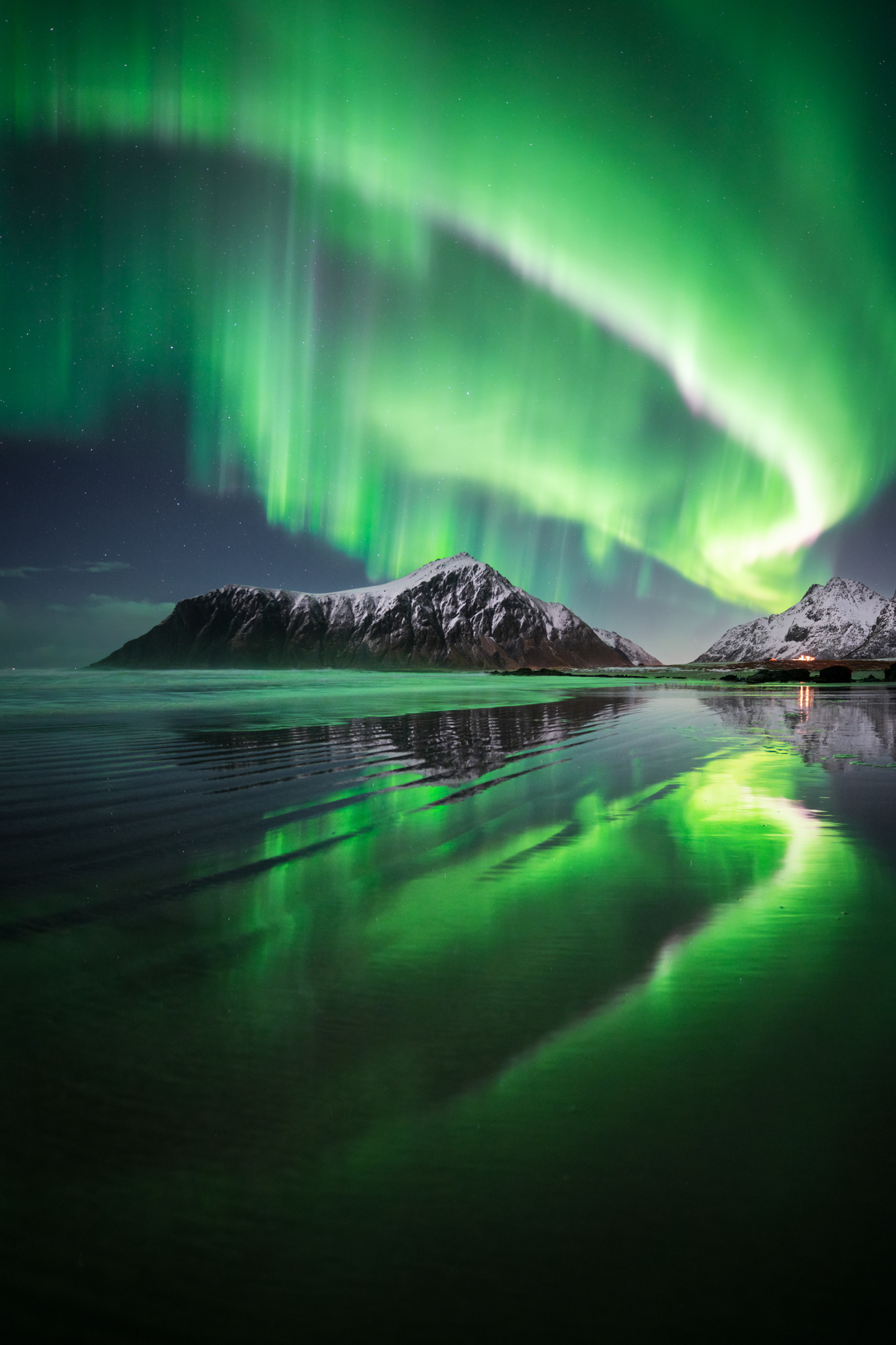 Angefangen hat das Abenteuer auf den Lofoten. Zu Beginn des Jahres reiste ich nach Nordnorwegen, um auf Fotoreisen zusammen mit meinen Teilnehmern Nordlichter zu jagen. Am Strand von Skagsanden hatten wir Glück, und das Potenzial der Linse zeigte sich. Schon die Testaufnahme, um überhaupt zu sehen, wie sich die Nordlichter bewegen, überzeugt. Mit einer offenen Blende von F1.4 können kurze Belichtungszeiten, hier von 2.5 Sekunden, realisiert werden, was zum „Einfrieren“ der dynamischen Nordlichter führt. Würde man länger belichten, wären die Strukturen unscharf. Selbst mit Blende F1.4 ist die Aufnahme über die Nordlichter bis zum Vordergrund scharf abgebildet, und die Vignettierung hält sich in Grenzen.