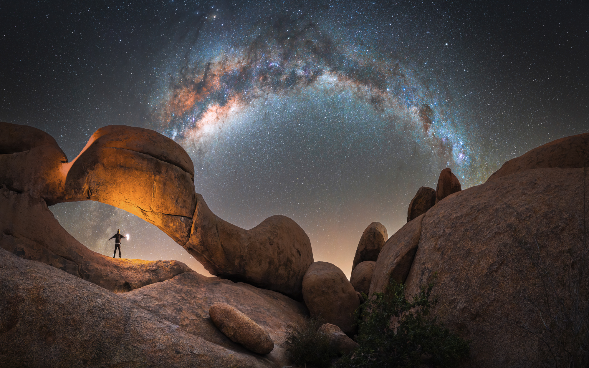 Alles in einer einzigen Aufnahme! Ich habe eine Belichtungszeit von 30 Sekunden bei ISO 5000 gewählt und bin begeistert von der Abbildungsqualität, da Vordergrund und Sternenhimmel selbst bei komplett offener Blende von F1.4 sehr scharf und detailliert abgebildet sind. Es ist eine hervorragende Linse, um die Faszination der Astrofotografie mit anderen zu teilen. Auch in der Astrolandschaftsfotografie kann man den Bildwinkel mit der Panoramafunktion erhöhen, und so lässt sich im Anschluss die komplette Milchstraße als sogenannter Milchstraßenbogen über dem Steinbogen festhalten. Ganz ohne komplizierte Bildbearbeitung, nur mit Adobe Lightroom, wird das Panorama, bestehend aus 6 Einzelaufnahmen, automatisch zusammengesetzt. Auch hier bin ich wieder begeistert von der Schärfentiefe bei F1.4. Das Sigma 14mm F1.4 DG | Art macht einfach Spaß und ist bestens für die Astrolandschaftsfotografie geeignet.
