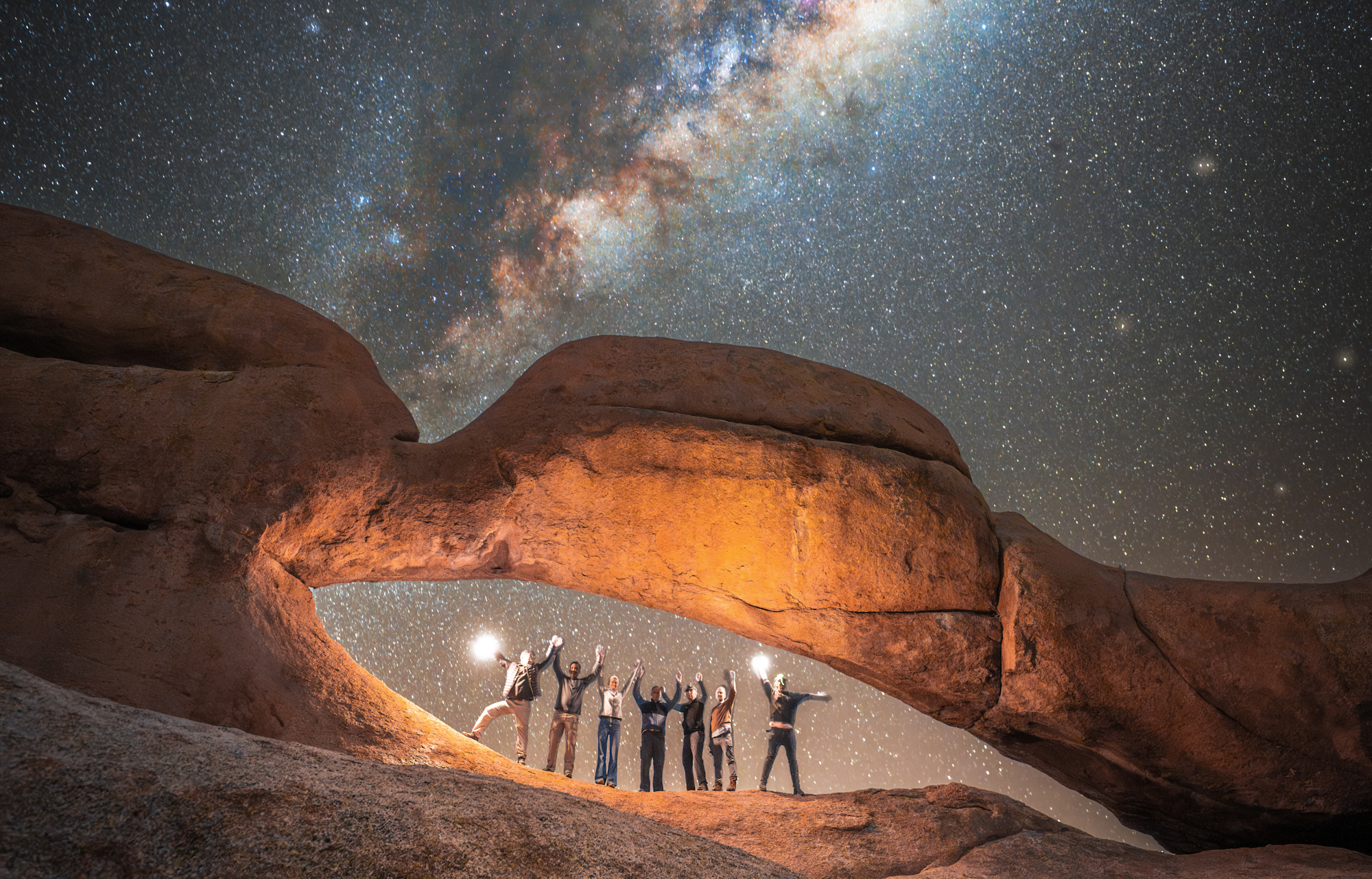 Das Sigma 14mm F1.4 hat seine unglaubliche Schnelligkeit bei gleichzeitiger Schärfe und geringer Vignettierung bei den Nordlichtern eindrucksvoll unter Beweis gestellt, doch wie schlägt es sich, wenn es darum geht, den Sternenhimmel mit Milchstraße aufzunehmen? Dafür habe ich die Linse mit nach Namibia genommen. Namibia ist bekannt für seine Wüsten und ist deshalb perfekt für die Astrolandschaftsfotografie geeignet. Ich habe mich zur Spitzkoppe, dem Matterhorn Namibias, begeben, da dort ein imposanter Felsbogen einen interessanten Vordergrund bildet. Angekommen sehe ich, dass das Milchstraßenzentrum direkt über dem Felsbogen steht. Mit einer Blende von F1.4 lässt sich eine Aufnahme machen, bei der der Vordergrund ausreichend belichtet ist, aber gleichzeitig die Sterne aufgrund der Erdrotation keine Strichspuren bilden. Es ist also möglich, einfach zu fotografieren, ohne kompliziert mit Bildbearbeitungssoftware den Vordergrund und den Nachthimmel zu stacken oder auszutauschen. So etwas liebe ich, und meine Fotogruppe und ich konnten uns am Fotospot kreativ austoben und schlussendlich ein einzigartiges Gruppenbild machen. Wir stehen alle gemeinsam im leicht beleuchteten Felsbogen und über uns das Milchstraßenzentrum.