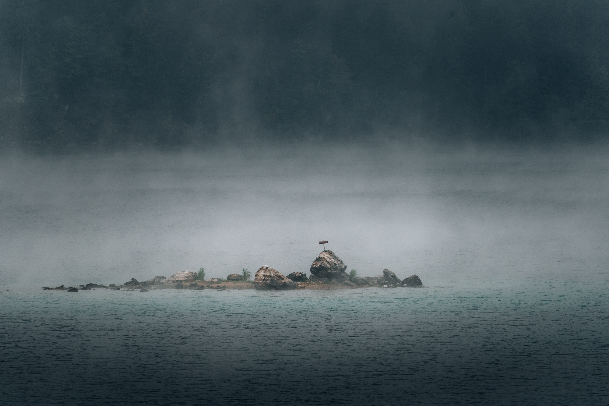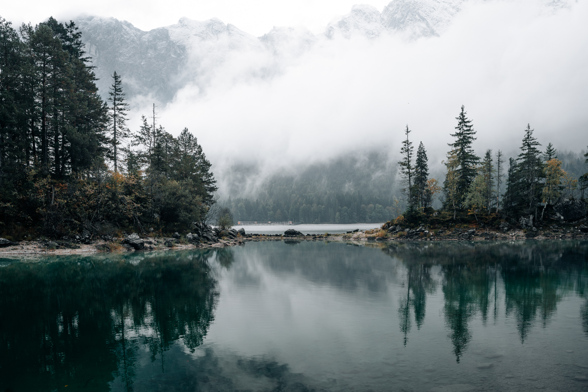 Am Eibsee gab’s dann mein absolutes Lieblingswetter: Nebelsuppe deluxe. Klar: Für Bergansichten ist das eher suboptimal. Aber für die Stimmung war es perfekt. Der See lag still und mystischzu unseren Füßen, während der Wald noch im Tiefschlaf lag. Ich entschied mich erneut für das 28-70mm, hatte aber das 100-400mm noch mit am Start, um ein paar Details in der Ferne auszukundschaften.