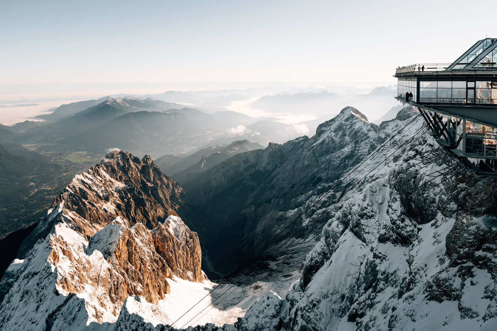 Am nächsten Tag kam das große Finale. Wer mich kennt, weiß: Blauer Himmel ist so gar nicht mein Ding. Aber an diesem einen Tag habe ich Sonnenwetter regelrecht herbeigewünscht. Wir wollten zum ersten Mal auf die Zugspitze – ja, okay, bequem mit der Gondel, die Kletterkarriere kommt bei mir definitiv nicht mehr. Und tatsächlich: Als wir am Parkplatz ankamen, strahlte der Himmel in einem Blau, das schon fast kitschig wirkte. Erste Gondel, rein und hoch … und ich gebe zu: ein bisschen mulmig wurde mir bei der Höhe schon. Oben ereilte uns dann Sprachlosigkeit pur. -11 °C, Wind im Gesicht, Sonne im Rücken und ein Panorama, das man nicht so schnell wegsteckt. Ich wechselte zwischen 28-70mm und 100-400mm, um wirklich jedes Detail mitzunehmen. Einer dieser Tage, die sich unauslöschlich ins Gehirn einbrennen.