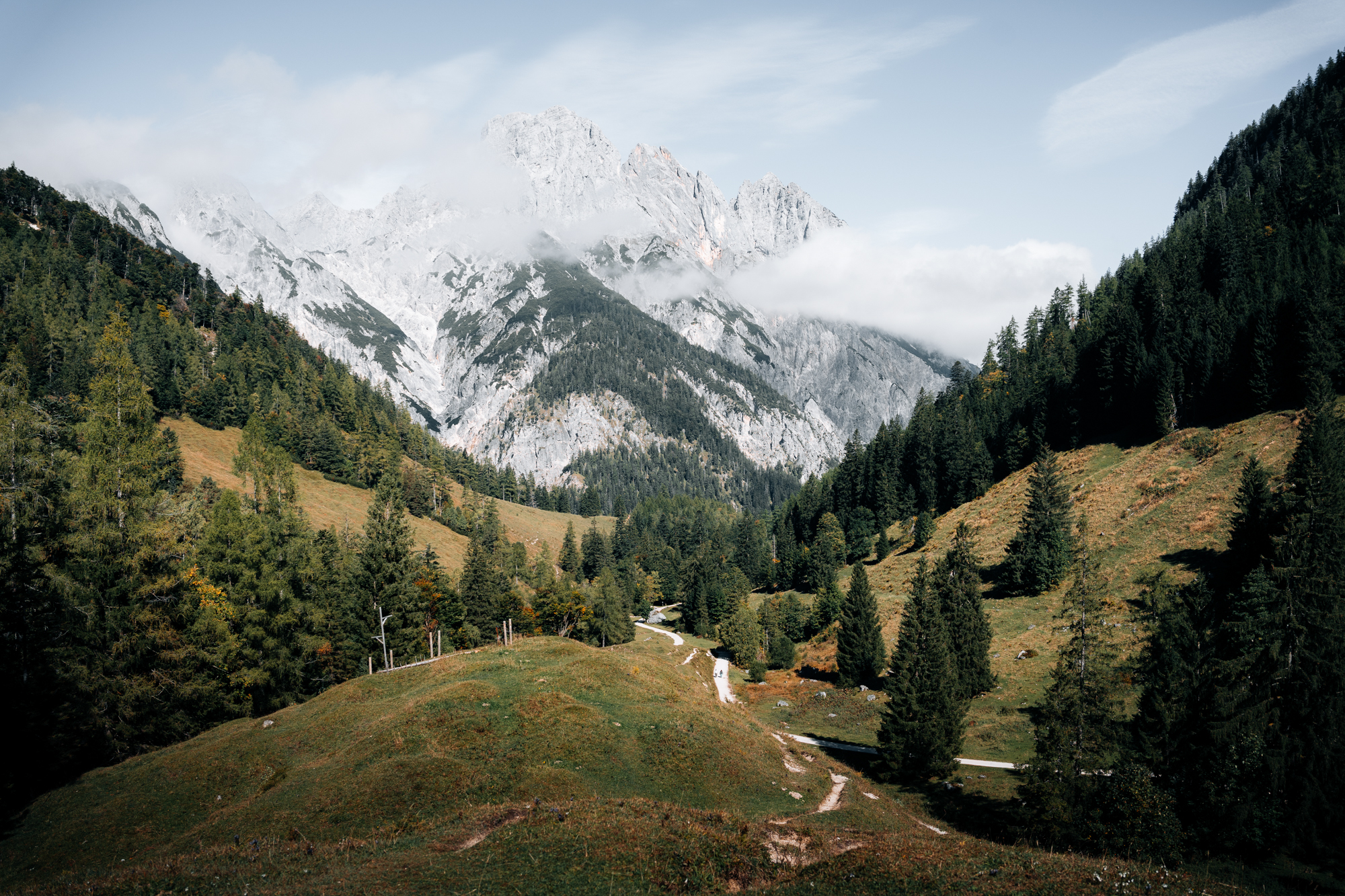 Am nächsten Morgen dann das komplette Gegenteil im Klausbachtal: blauer Himmel, ein paar dekorative Wölkchen, alles wie aus dem Wanderkatalog. Wir machten uns auf den Weg zur Alm und ich blieb gemütlich beim 28-70mm. Der Plan: traumhaften Kaiserschmarren essen. Die Realität: Almabtrieb. Also alles leer, Zäune offen, Kühe irgendwo unterwegs. Macht nix – wir hatten Snacks dabei und das Bergpanorama als Nachtisch. Am Ende besser als jeder Kaiserschmarren. Und zwischendurch zog sogar noch etwas Nebel zwischen den Bergen hindurch. Es war perfekt.