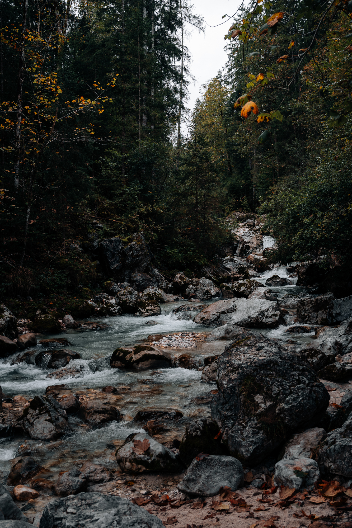 Die Wimbachklamm war danach das komplette Kontrastprogramm. Laut, wild und kraftvoll. Die Wassermassen donnerten durchs Tal, aber wir hatten die ganze Klamm für uns allein. Ein seltenes Glück. Mit dem 28-70mm und dem 17mm im Wechsel suchte ich nach Linien, Mustern und kleinen Momenten, in denen sich das Chaos für eine Sekunde beruhigte. Der Holzweg entlang der Klamm eignete sich dafür perfekt. Für mich das erste richtige Highlight unserer Tour.