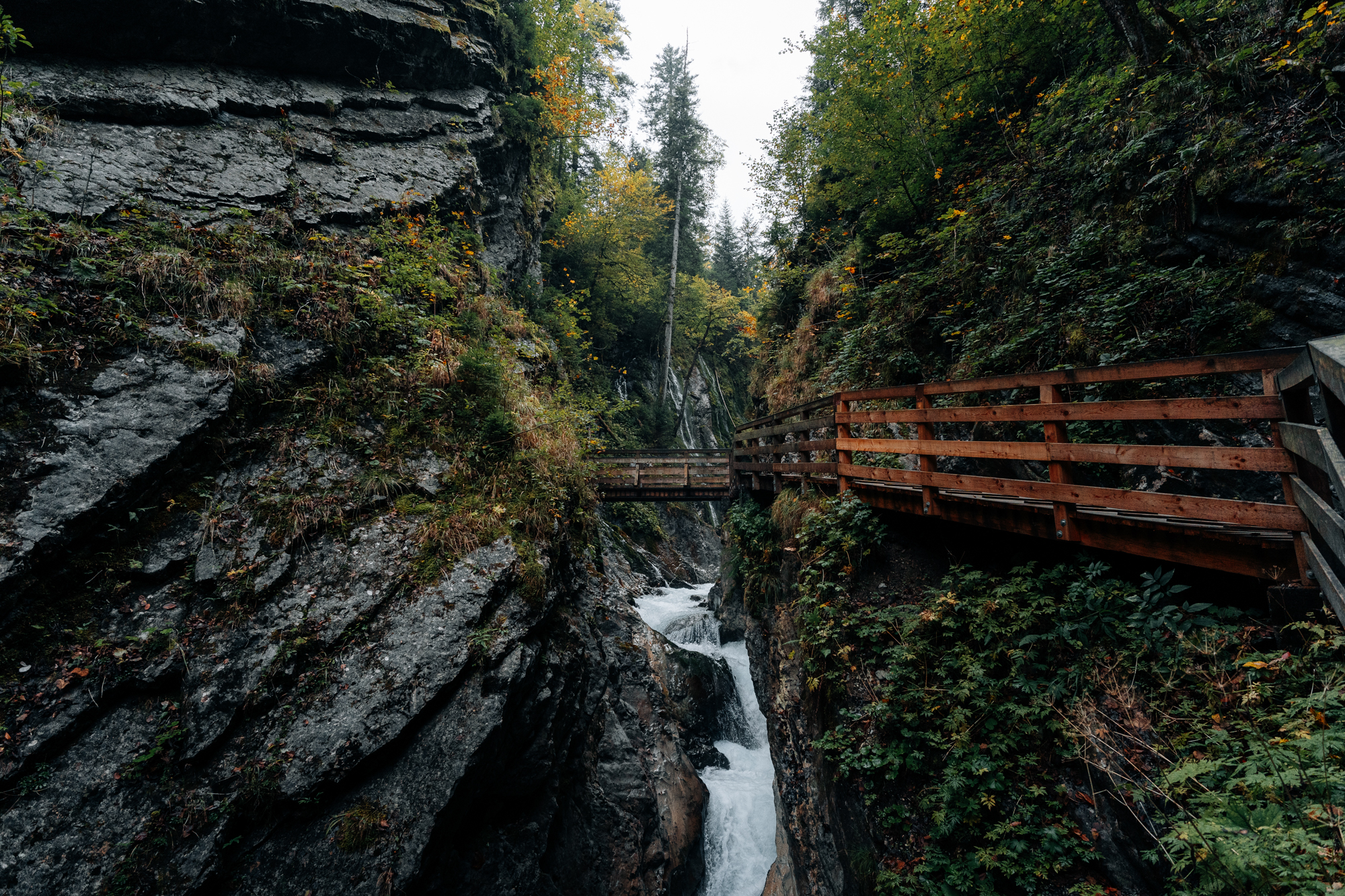Die Partnachklamm hat am nächsten Tag aber nochmal ordentlich nachgelegt. Es regnete ununterbrochen, aber hey – wenn man schon da ist, wird nicht umgedreht. Der Wald hielt das Gröbste ab und wieder wartete dieses traumhafte diffuse Licht auf uns. Als wir in der Klamm ankamen, schoss das Wasser wirklich aus allen Richtungen – oben, unten, seitlich, frontal. Ich war selten so froh über Regenjacken und wetterfestes Equipment. Die Location selber wirkte fast wie aus einer anderen Zeit – wären da nicht die Menschenmassen gewesen. Dank des Weitwinkels konnte ich auch auf engem Raum die Klamm in ihrer ganzen Schönheit einfangen. Im Vergleich gewann für uns am Ende trotzdem die Wimbachklamm: weniger Drama, mehr Ruhe.